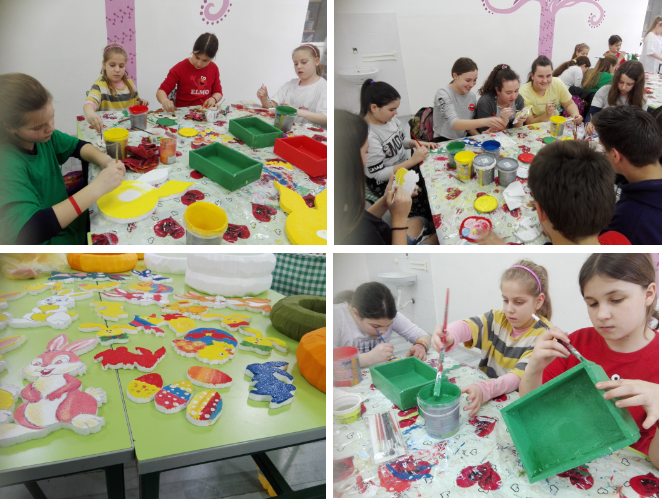 U okviru projekta Jednosmenski rad, u našoj školi, na radionicama "Kreativni atelje", učenici su vredno radili, stvarali, družili se i pripremali se za prodajnu Ukršnju izložbu. Kako ove godine, zbog situacije u kojoj se nalazimo, nismo bili u mogućnosti da organizujemo izložbu, želeli smo da sa vama podelimo atmosferu sa ovih radionica kao i radove koji čekaju neka bolja i lepša vremena.